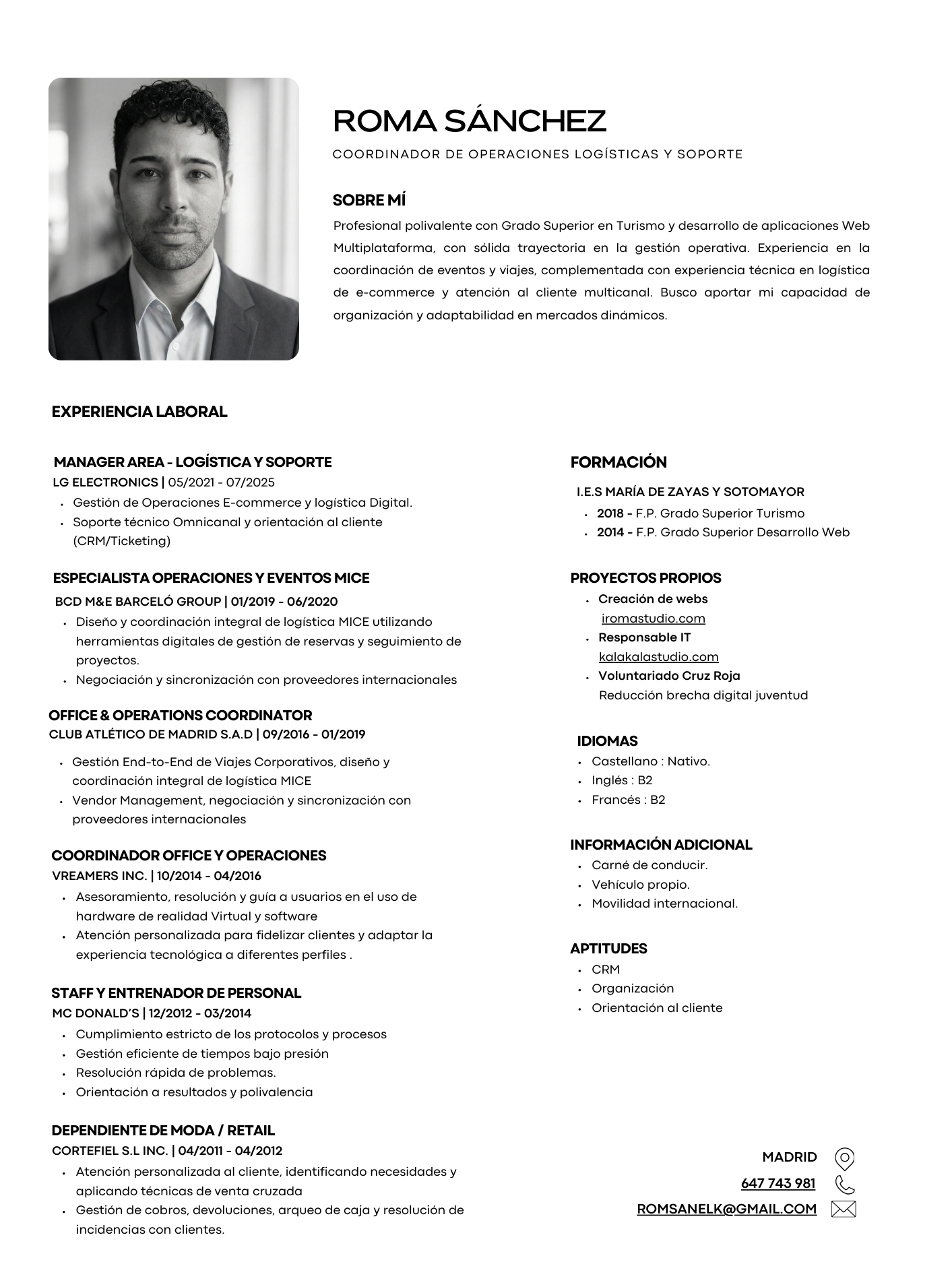 Profesional polivalente con Grado Superior en Turismo y desarrollo de aplicaciones Web Multiplataforma, con sólida trayectoria en la gestión operativa. Experiencia en la coordinación de eventos y viajes, complementada con experiencia técnica en logística de e-commerce y atención al cliente multicanal. Busco aportar mi capacidad de organización y adaptabilidad en mercados dinámicos.